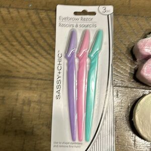 Price includes everything shown. A set of three eyebrow or face razors, four bath bombs, a 5ml VDL Lumilayer primer, and a sample of posh brightening eye cream. All new. Also includes a half full CeraVe acne control gel.