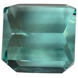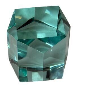 Elegant faceted aqua glass cube paperweight. Features a gem-cut design that reflects light beautifully, perfect as a desk accessory or modern home accent. Crafted from thick, solid glass, this vintage-inspired piece offers both function and sophistication. Preowned in gently used condition with no major flaws.