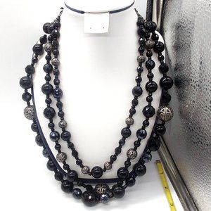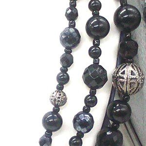 Faceted Black Beaded & Silver-tone Necklace Adjustable Sliding Knot