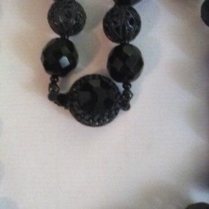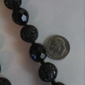 Faceted Black Beads and Filigree Black Beads on a Knotted Necklace with a box style closure. Measures approximately 16" long.