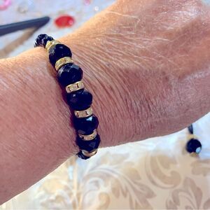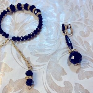 Faceted Black Glass Bracelet & Clip On Drop Dangle Earrings Vintage Gorgeous