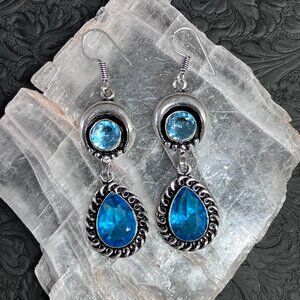 Earrings of faceted created blue topaz gems with crescent moons in 925 silver settings, with 925 ear wires.