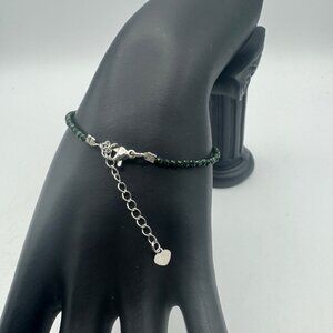 Faceted Dark Green Bead Bracelet Adjustable 6-8 Inches Silver Tone Heart Charm