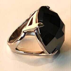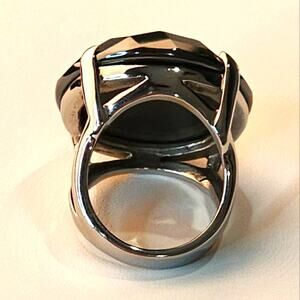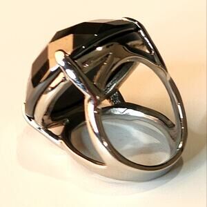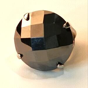 Fun fashion ring, oversized faceted hematite stone in ring, stainless steel, excellent condition. Size 6. Marked Milor.