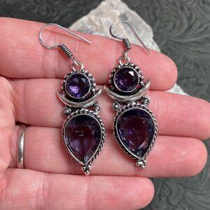 Earrings of faceted purple amethyst gemstones with sun and lunar crescent moons, in 925 silver settings, with 925 ear wires.