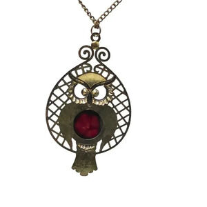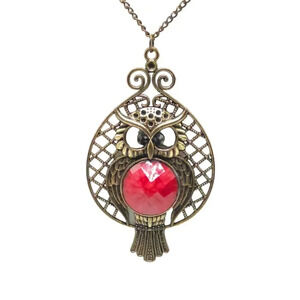 Faceted Red Round Stone Openwork Horned Owl Pendant Chain Necklace