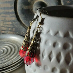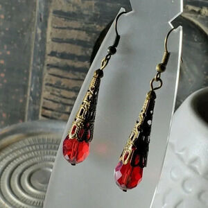 Faceted Ruby Red Luster Crystal Antique Bronze Filigree Teardrop Earrings