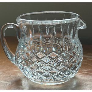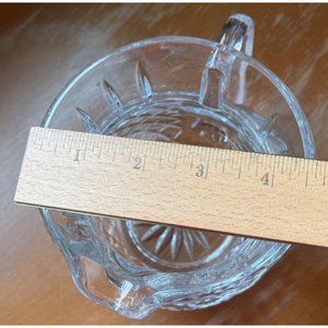 Cute and sparkly! Very heavy vintage glass pitcher, no labeling so cannot verify if crystal or not. Top edge has distinct sharp edge and there are vertical 'seams' evident. About 5x5" size. Many potential uses.