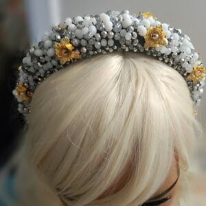 Headband is hand crafted. Each bead is hand sewn to make this headband a masterpiece.