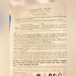-Pore care & Clarifying Mask is infused with Tea Tree, 2Days Mask Tea Tree contains 2 sheet masks - the perfect solution for a refreshing and rejuvenating facial experience! This dynamic duo of Vegan certified ultra-fine lyocell & bamboo sheets is carefully crafted to hug your face for maximum essence absorption, providing a lightweight yet deeply nourishing hydration that will leave you feeling revitalized and rejuvenated. Infused with a fresh and hydrating essence, our Tea Tree formula works to control excess sebum production, fight acne, and clear pores, leaving your skin instantly clarified, smooth, and clean-