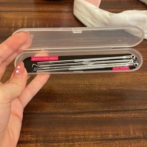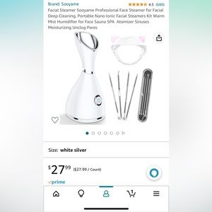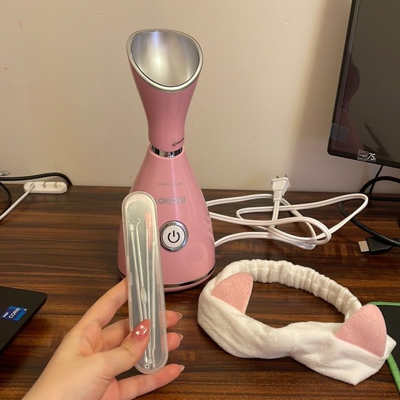 Facial steamer for deep facial cleansing. Used only a few times, bought it from Amazon (screenshot with the price attached), comes with a pore cleaning tool kit (4 pc) and a cute little hair band with baby pink cat ears