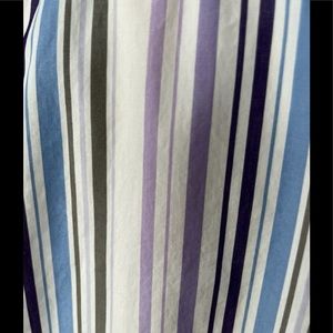 Size XS. Shirt is white with taupe, sky blue, violet and purple stripes. Removable collar stays.