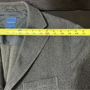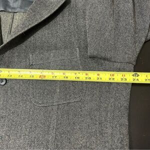 Faconnable Men’s 100% Wool Sport Coat Jacket Blazer Herringbone Gray Sz L. 3-button front enclosure. Notched lapel, 4-button at cuff, back vent. One patch pocket at chest and 2 patch hand pockets. 4 additional pockets inside, one with zip enclosure. EUC. Please see approximate flat lay measurements shown on photos.