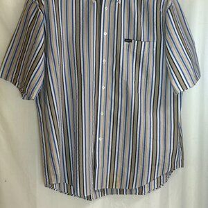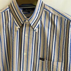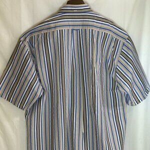 Faconnable Men's Button Down Striped Short Sleeve Shirt - Beige~Blue~White - XL