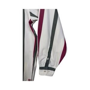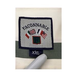 The Faconnable Men's XXL 2XL White Stripe Embroidered Crest Button Up Academia shirt is a stylish and sophisticated addition to any man's wardrobe. Made with a woven fabric, this long sleeve button-up shirt features a multicolor striped pattern with an embroidered crest detail, adding a touch of elegance to the design. The regular size fit makes it comfortable to wear for various occasions, making it a versatile and timeless piece for the modern man.