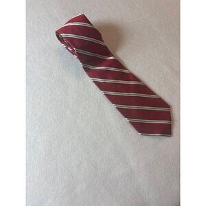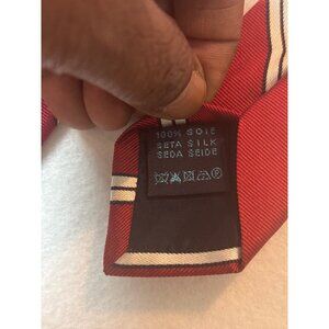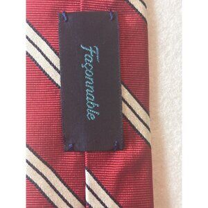 This Faconnable tie is crafted from premium 100% silk, offering a smooth texture. Its red hue with white stripes adds a touch of elegance to any formal attire.