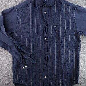 Faconnable Striped Small Linen Blue Shirt Mens Button Up Long Sleeve Pocket