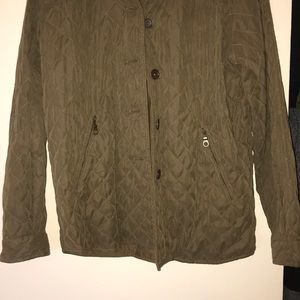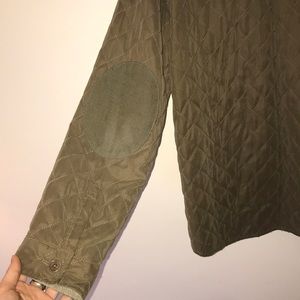 Olive green button down jacket. Two slanted zipper pockets on front. Corduroy patches on elbows. Perfect condition!