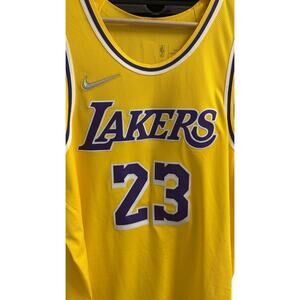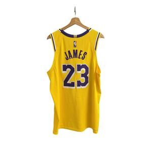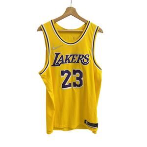 The product is an authentic Nike NBA Los Angeles Lakers LeBron James Icon Edition jersey in size L. It is officially licensed by the National Basketball Association and features the iconic LeBron James player name and team logo. The jersey is in the signature gold color of the Lakers and is designed for men who are fans of basketball and the Los Angeles Lakers team. This jersey is perfect for wearing during the regular NBA season to show support for LeBron James and the Lakers.
