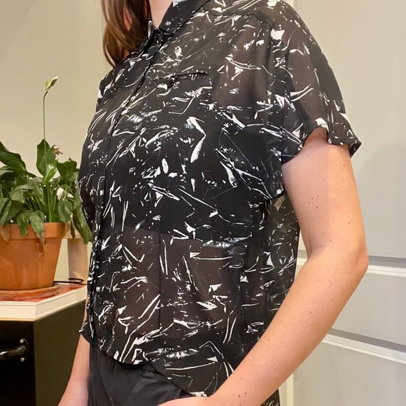 Factory by Erik Hart sheer high-low button-up short-sleeved collared shirt. The pattern on this shirt is so cool, it might look black but it’s actually a dark navy!