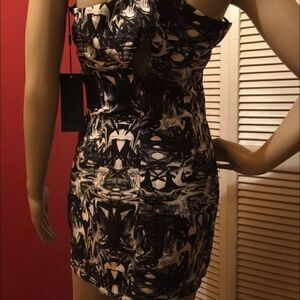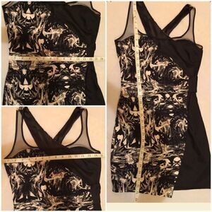 Beautiful and comfy mini bodycon dress. This dress has a contrast mesh on the top and open crisscross back. It's fully lined and has a back hidden zipper... Color is black/off-white...