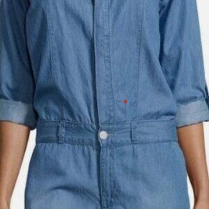 This is a women's denim romper from the brand Fade to Blue. It has a collared neckline and a button closure with long sleeves that can be rolled up. The romper is made of 100% cotton and is lined with pockets. It has a straight leg style with a 4-inch inseam and comes in a dark wash blue color. The romper is suitable for travel and casual occasions and can be worn in summer, fall, and spring.