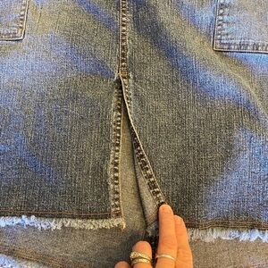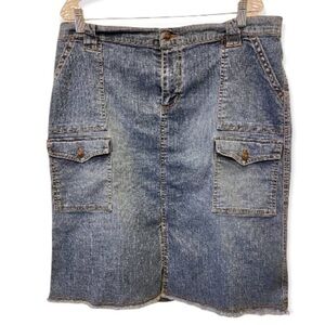 Faded Glory 18W Stretch Denim Skirt Front & Back Pockets Front Slit, Frayed Hems