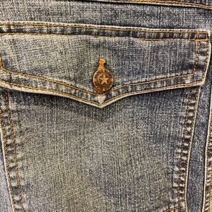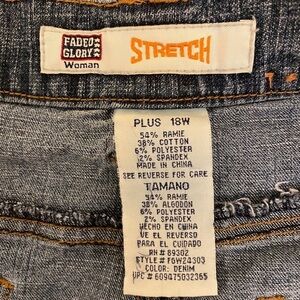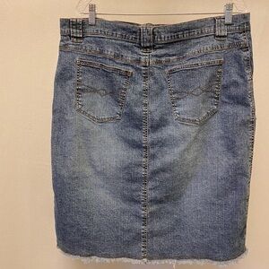 Faded Glory 18W Stretch Denim Skirt Front & Back Pockets Front Slit, Frayed Hems. Preowned. Nice condition. Waist measures approx 38”. Top of skirt, to the bottom of the hem measures approx 24.5” long. There is a front flap that helps for sitting and other motions. You will love all the pockets this skirt has. Look great in this versatile skirt that works with any top, and any occasion!