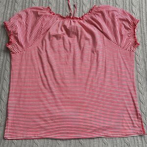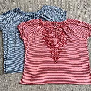 Faded Glory 2 Striped Oversized Tees with embroidery. Size: 2x ( 16W - 18W) Good used condition - have some signs of wear - selling as is. Wide stretchy neckline with tassels. Short sleeve. Measurements approximately while laying flat: Length: 28” Sleeve: 10” Armpit to armpit: 26”. Smoke free and pet free home.