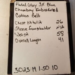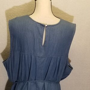 Faded Glory Womens Plus Size 3X (22W-24W) Dress 100% Cotton Blue Chambray Sleeveless Keyhole Button on Back Knee Length Lightweight Belted Embroidered Floral Bohemian Cottagecore BOHO Classic Sundress