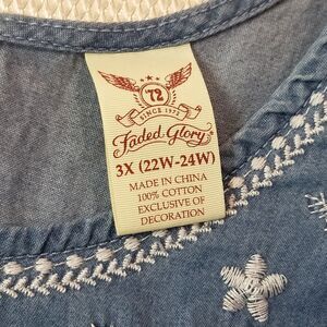 Faded Glory 3X Dress 100% Cotton Chambray Sleeveless Embroidered Floral Boho
