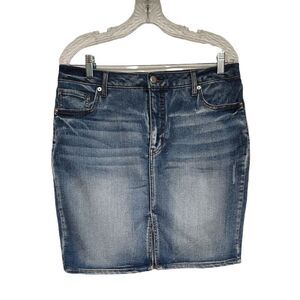 Faded Glory Blue Denim Mini Skirt Front Slit Faded Stretchy Size 12