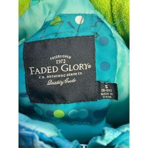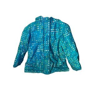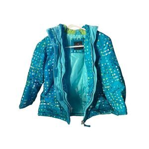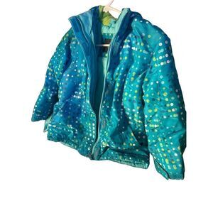 This is just the sweetest jacket! Made by Faded Glory Size 6-6X. It’s a Teal Blue/Green with Green Blue and White Polka Dots. It has a Full Zip Closure along with A Velcro Closure even at the Wrists. It is Lined with Two Side Pockets and Hooded. What’s nice about this is that it’s not super bulky but still very warm and insulated for your little princess!