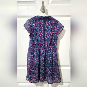 This delightful sundress by Faded Glory showcases a vibrant floral pattern in blue and pink, ideal for casual occasions. The dress features a charming sailor collar and flutter cap sleeves, offering a playful yet classic look. Its breezy design ensures comfort and style for sunny days.