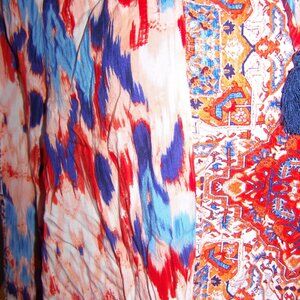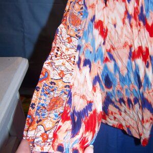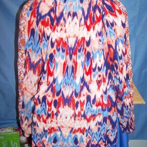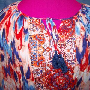 Tie with tassels at the neck. Vibrant colors. Elastic at the wrists. Free flowing shirt. Lightweight and easy to wear. Coordinating pattern down the front and sides of the sleeves.
