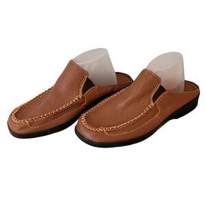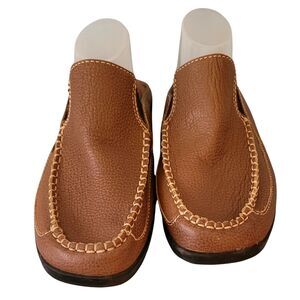 Faded Glory Brown Leather Clogs Mules 7 Slip On 1" Heel White Stitching loafer