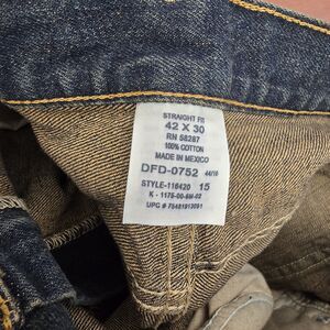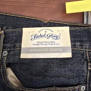 The product is a pair of Faded Glory dark blue original fit jeans in size 42 x 30. Made of cotton denim fabric with a light wash, these zippered jeans feature a straight leg style and come in a regular fit. They also include pockets for added convenience. Perfect for men looking for comfortable and easy-care jeans with a classic blue color.