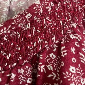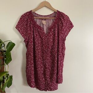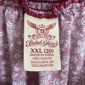 GUC This charming top from Faded Glory features a rich dark red hue, called Merlot, with a dainty white floral print. This top has a smocked border around the neckline, buttons down the front, and cap sleeves. The blouse's soft and lightweight 100% Rayon fabric make it comfortable for warmer weather or layering.