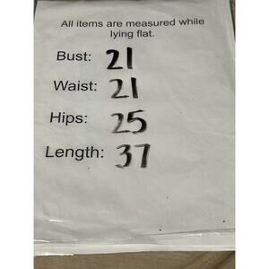 Tag size: Large (12-14); approximate flat measurements: Bust 21", Waist 21", Hips 25", Length 37"