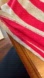 This gray and fuchsia striped short sleeve shirt is perfect for everyday casual wear. Bottom seam has some rips in the stitching and a small pin hole on the back bottom left.