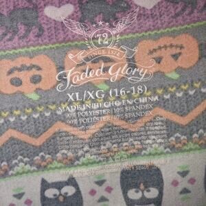 Faded Glory Halloween Fair Isle Print Black & Orange Leggings in Size XL (16-18). EUC. No tears, holes or stains. This fair isle print is too cute! It features owls, ghosts, bats, black cats, monster letters and pumpkins. So sad so part with, but I'm no longer this size. Well taken care of and hung dry. 90% Polyester 10% Spandex.