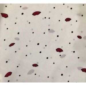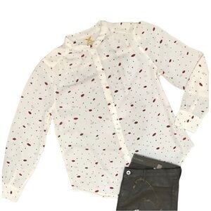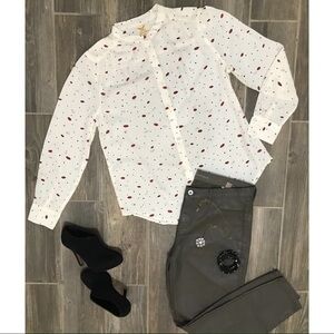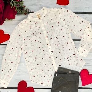 Sweet lips adorn this sheer cream Button Down Blouse. Made of 100% polyester. Measures 20" bust, 24" length, 23" sleeve. Sized 4/6. NWT