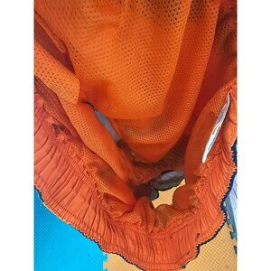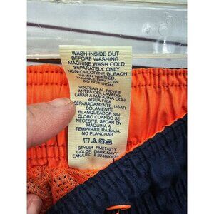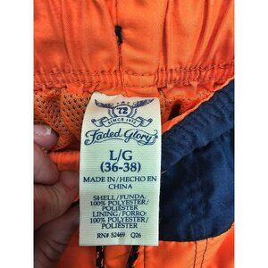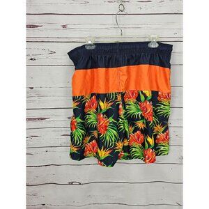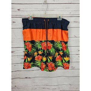Vibrant orange and navy Faded Glory Men's Hawaiian Floral Swim Trunks. Size L. Polyester material with elastic waist and drawstring. Perfect for summer beach outings.