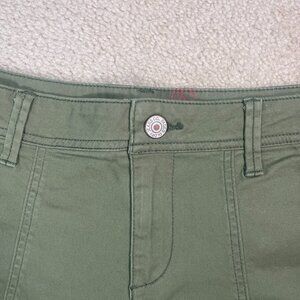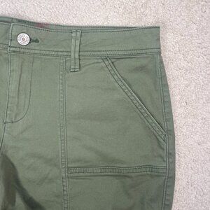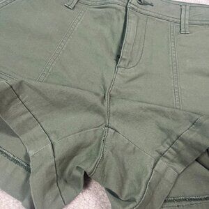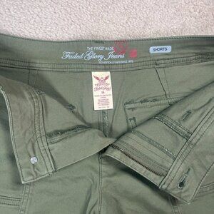 Faded Glory olive green utility shorts with a casual and versatile design. Features front utility-style patch pockets, belt loops, and button/zip closure. Back flap pockets with button detail add a classic utility touch. Size 14. Perfect for everyday wear, pairing with tees, tanks, or casual tops.