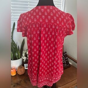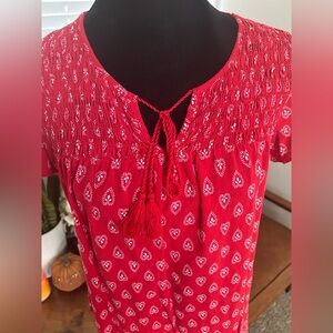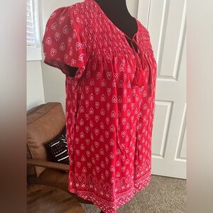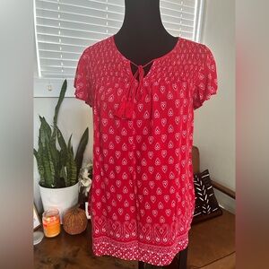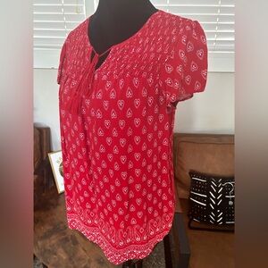 Chic red blouse with white patterns. Features a tie-front detail. Ideal for casual wear.