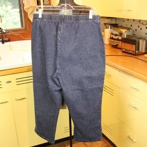 This is a pair of capri type jean pants. They have a elastic waistband and the material itself stretches. The bottom of the legs have a slit in the sides for more flex. They are marked as size XL and are about 17 inches at the waist flat and not stretched and the inseam is about 20 inches. They are in really nice shape, maybe never used.