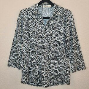 Faded Glory Womens Top Size Medium Brown Black White Print Knit Popover Collared Casual