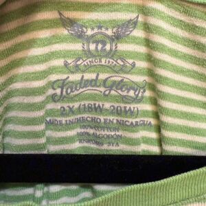 Gently worn Faded Glory green striped t shirt in size 2x 18w-20w. Some minor pilling on the shirt, pictured in photos. Crew neck. Fun and casual.