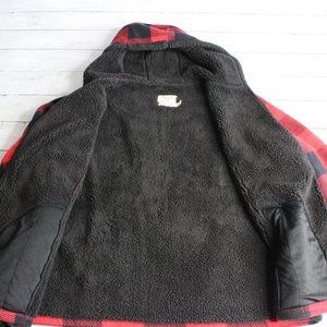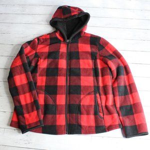 This cozy long sleeve casual jacket is red and black buffalo plaid. It has a full front zipper, pockets and an attached hood. It is heavy weight and is lined with faux shearling fleece. It is in excellent hardly used condition however please know there is very slight lint on the fabric.