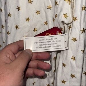 This brand new, charming shirt features an all-over metallic gold star pattern on a crisp white background. Perfect for casual wear, holidays, or adding a touch of fun to your everyday wardrobe. The lightweight, stretchy fabric ensures comfort and a flattering fit.